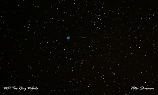 This photo is of M27, The Dumbbell Nebula, a planetary nebula (PN) in the constellation of Vulpecula, M27 lies at a distance of about 1360 light years from us. It has two gas shells moving away from the central star, the Oxyegn shell is moving at 15 Km per second while the Nitrogen shell is moving at 30 Km per second. This was a 35 second exposure at ISO 1600.